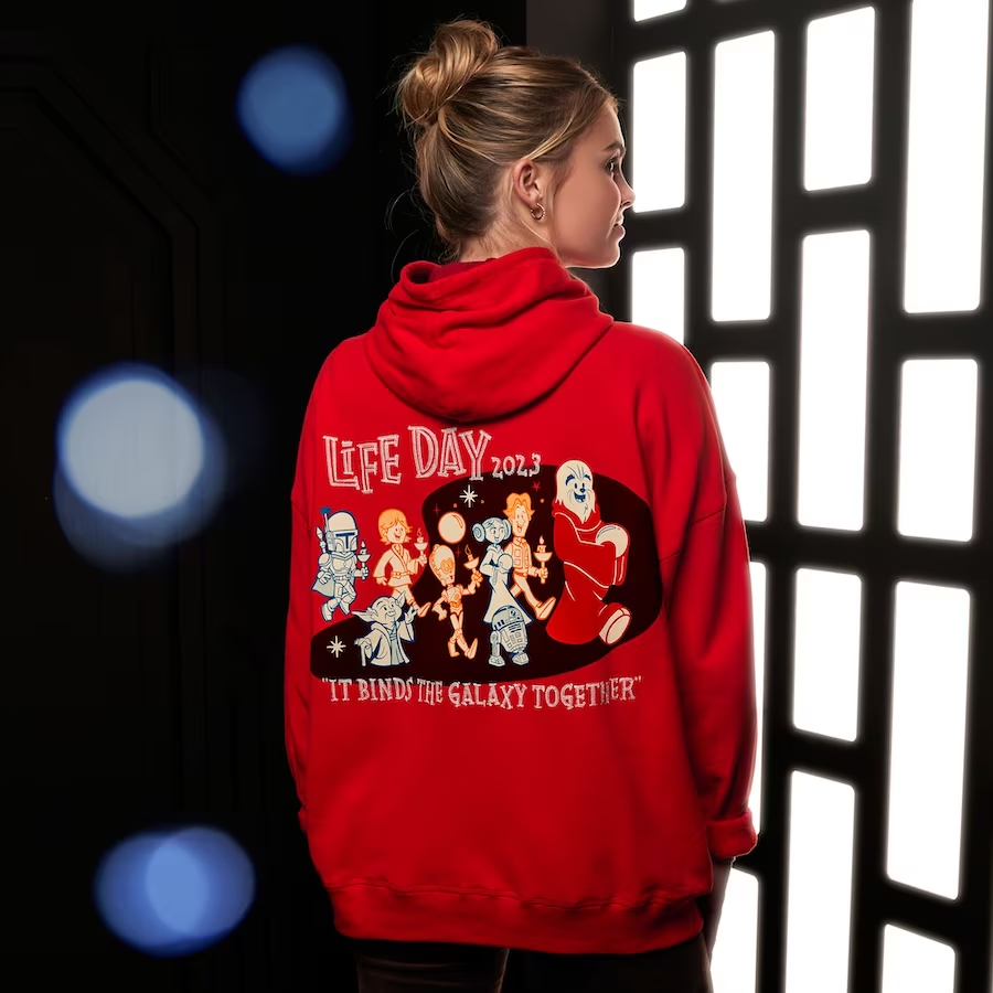 Whether fans want to don the traditional red Life Day robes or commemorate the holiday in a more casual style, we have you covered! Check out the new Star Wars Life Day 2023 Zip Hoodie for Adults, featuring stylized screen art of characters including Chewie, Luke, Leia, and Han Solo, available Nov. 17 exclusively on shopDisney. This Star Wars Life Day 2023 zip hoodie is full of enough festive spirit to last a lifetime!